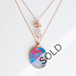 Beautiful handmade bright copper necklace with a resin pendant featuring the painting “Rainbow Aura Skies," and a wire wrapped angel aura quartz point.